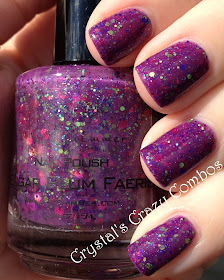 Next we have Sugar Plum Faerie!  This is 3 coats along with Poshe and Seche Vite top coats.  This polish is such a unique mix!! I love the purple/plum jelly base that is filled with fuchsia, lime green, and purple glitters!  I just love all the sizes, especially the tiny little ones in this!!  The glitters have a bit of holographic shine to them, so it makes this polish really sparkle!