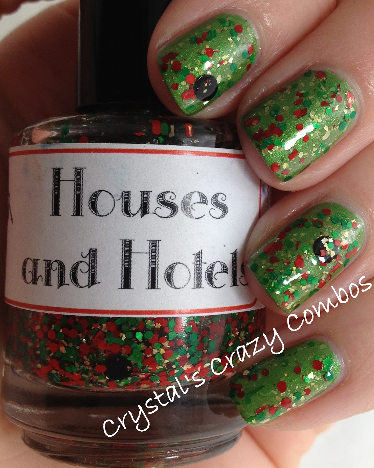 Jenna says: Not meaning to I created the perfect Christmas polish with this color. It's all sorts of green and red glitters with gold flakies and a few black dots. Why black dot? When we get into a huge game sometimes we have the option of having more than one hotels per property when that happens we use Trivial Pursuit wheels. I told you, we have a frankened game.